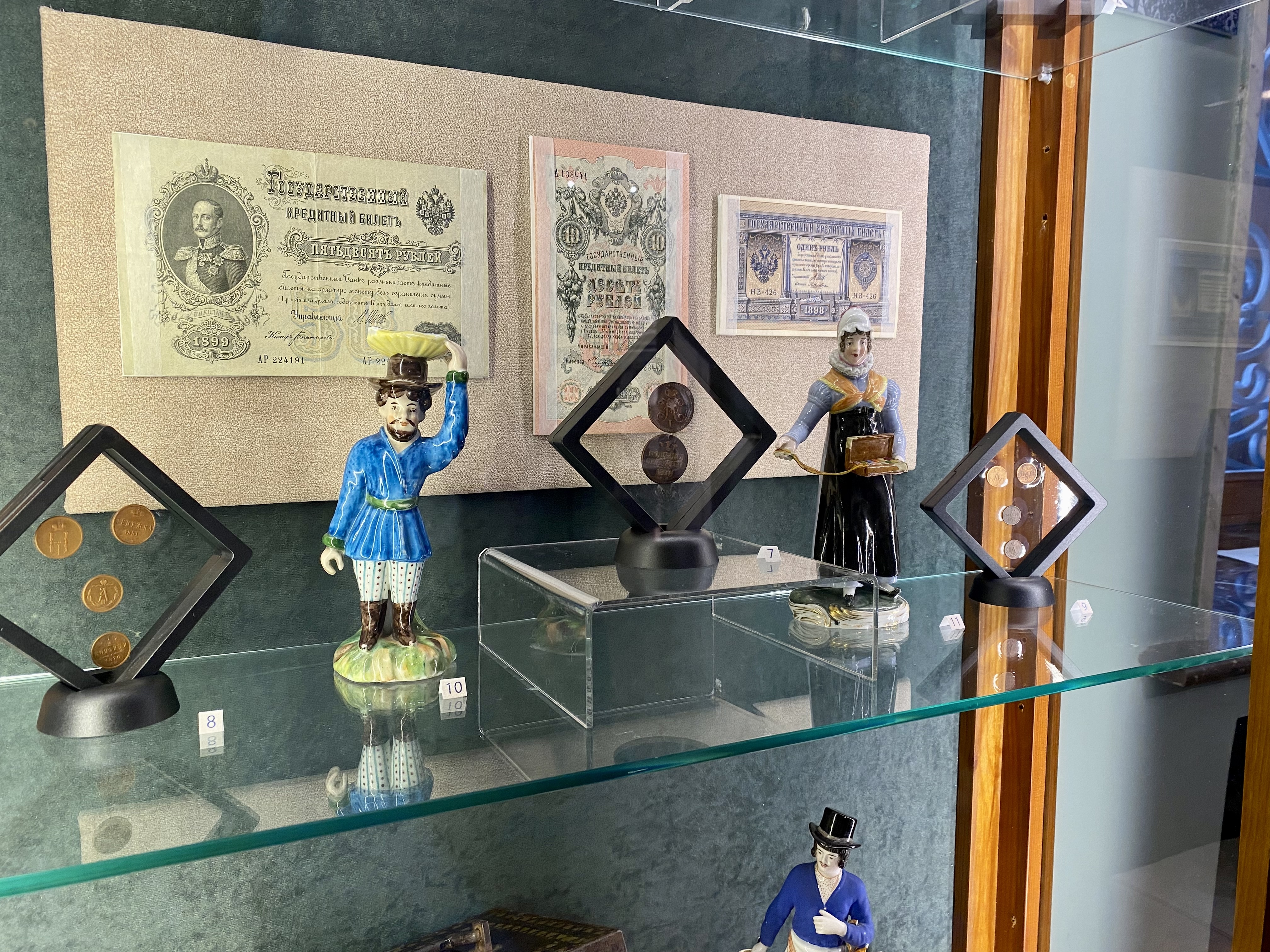Печатный вариант Указа императора Александра I о переносе Макарьевской ярмарки в Нижний Новгород, уникальная готовальня с полным набором чертёжных принадлежностей инженера-архитектора Петра Даниловича Готмана, разнообразные азиатские товары и изысканные предметы западноевропейского привоза также представлены в витринах. Среди них можно увидеть немецкую скрипку последней четверти XIX века, изготовленную по модели скрипки Страдивари, а также микроскоп знаменитой фирмы «Leitz» 1913 года. Одним из центральных экспонатов выставки является люстра в восточном стиле, подаренная, по легенде, персидским шахом Савве Морозову и украшавшая его ярмарочный торговый павильон.