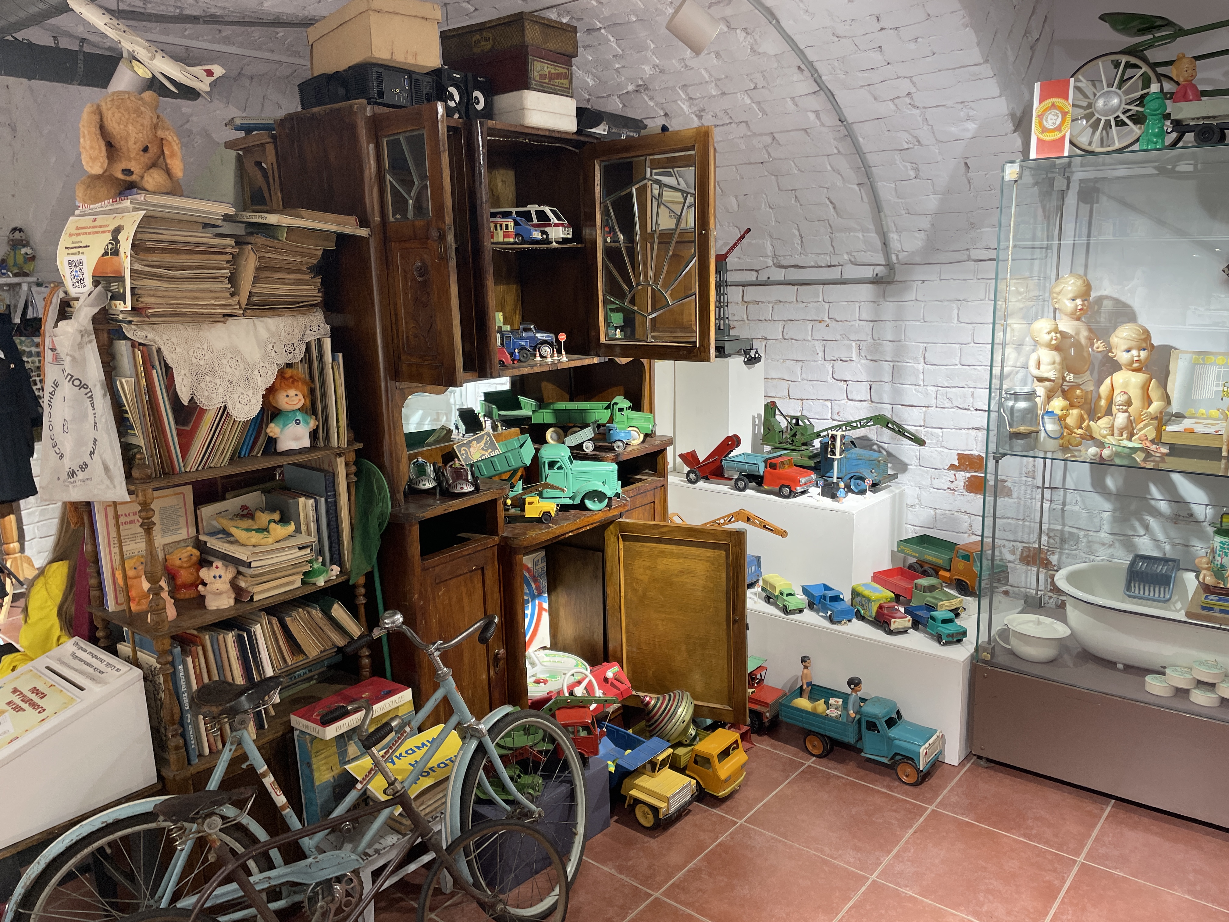 Экспозиция включает в себя куклы, машинки, железные дороги, плюшевые и механические игрушки советского и зарубежного производства. Среди представленных экспонатов встречаются редкие и уникальные экземпляры, такие как пупсы 1900 г., шарнирная кукла 1926 г., плюшевая игрушка «Кот в сапогах» 1937 г. и другие.