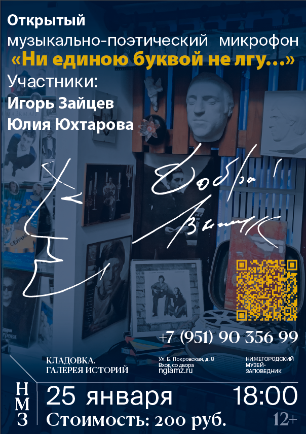 “Кладовка. Галерея историй” приглашает всех желающих на вечер творчества поэта, барда, актера Владимира Высоцкого, посвященный дню его рождения.