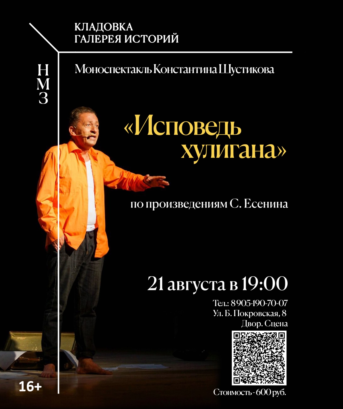 Приглашаем вас на поэтический моноспектакль по творчеству Сергея Есенина "Исповедь хулигана" в исполнении Константина Шустикова, выпускника Санкт-Петербургской государственной академии театрального искусства.