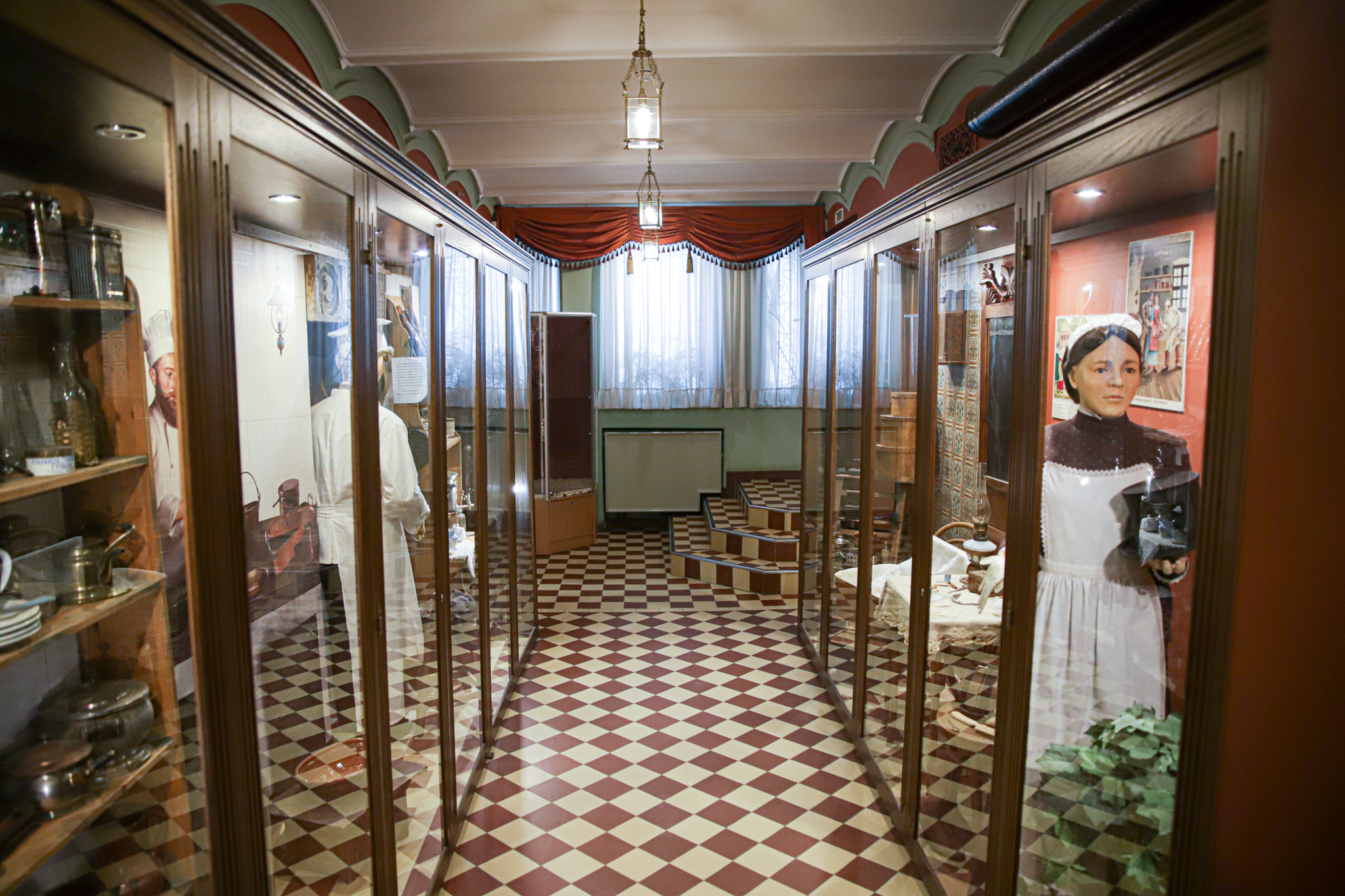 Значительную часть кухни в купеческом доме занимала большая плита, топившаяся дровами, стены кухни были облицованы белоснежной плиткой и заняты посудой, хозяйственной утварью, образцы которой представлены сегодня на выставке «Возле господской кухни…», Из подлинной отделки сохранились фрагменты метлахской плитки на полу.