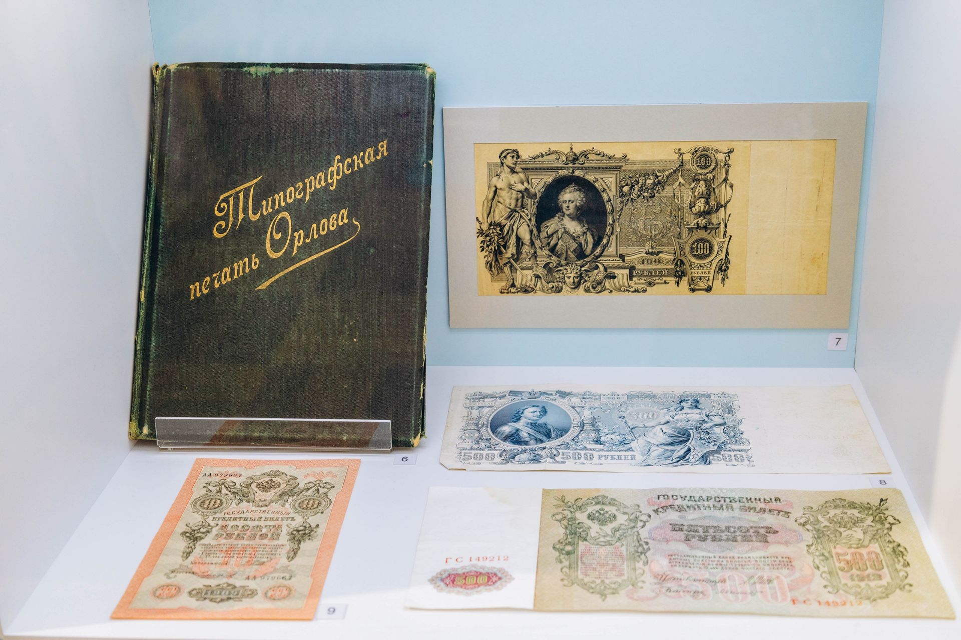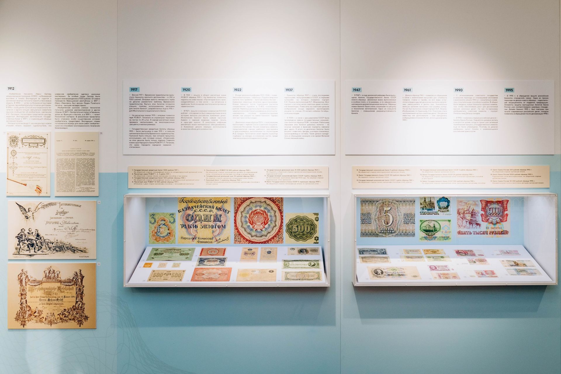 Центральное место в экспозиции занимают подлинные банкноты конца XIX – начала XXI веков, среди которых выделяются признанные шедевры мирового банкнотного искусства: знаменитые «катенька» и «петенька» — государственные кредитные билеты достоинством 100 и 500 рублей выпуска 1910–1912 годов. Помимо нумизматических редкостей на выставке представлены личные вещи Ивана Орлова, переданные музею его потомками, а также редкие цифровые копии документов и фотографий из личного архива внучки изобретателя Н.Н. Орловой, из фондов Гознака, Всероссийской патентно-технической библиотеки и федеральных архивов.
