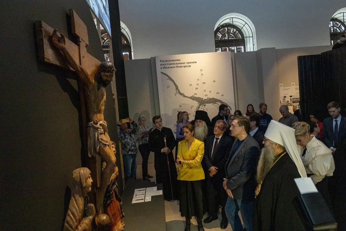Еще один раздел посвящен спасению архитектурного наследия региона. С 2021 года по благословению митрополита Нижегородского и Арзамасского Георгия в Нижегородской области ведется системная работа по консервации руинированных храмов. На выставке представлена карта таких объектов. На примере 48 храмов раскрывается их краткая история, подкрепленная фотоматериалами в формате «до» и «после», демонстрирующими результаты трудов по консервации.