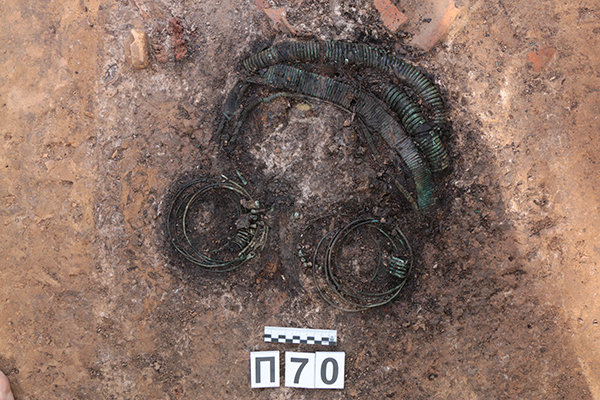 Совершенно иная ситуация прослежена в южной части могильника. Здесь отмечена рядно-групповая планировка погребений, между которыми фиксируется значительные расстояния. Могильные ямы отличаются большими размерами, но при этом они шире, чем на раннем участке: шириной до 2 м при длине более 3 м. Погребальный обряд в этой части могильника почти не изменился – погребения, как и в ранний период ориентированы на север и внутри фиксируются погребальные конструкции. Но если погребальный обряд не претерпел значительные изменения, то в материальной культуре наблюдаются кардинальные трансформации, особенно в женском уборе, который в традиционных обществах является отражением культурной идентичности.