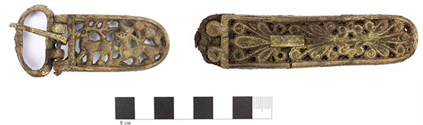 Не менее примечательным является мужское погребение, относящиеся к этому же хронологическому периоду. Погребенный мужчина сопровождался топором-кельтом, пешней и двумя ножами. В области таза у него расчищен поясной набор, состоящий из пряжки, подковообразных и арочных накладок с позолотой на лицевой стороне. Второй похожий поясной набор, в который входила массивная шарнирная пряжка с длинным щитком с литым изображениями животных, полукруглыми накладками с вырезным орнаментом и наконечником ремня, орнаментированным пальметтами, расчищен в соседнем погребении. В этом погребении помимо оружия обнаружена глазовская гривна. Подобные поясные наборы имеют аналогии в Прикамье в материалах ломоватовской и неволинской культур, что вкупе с глазовской гривной указывает на восточное направление контактов муромы в это время.