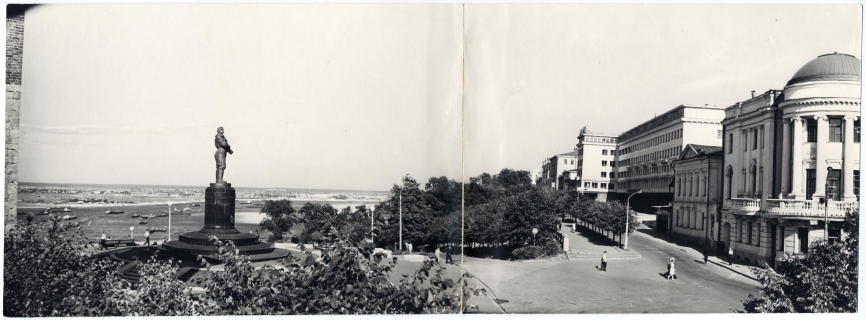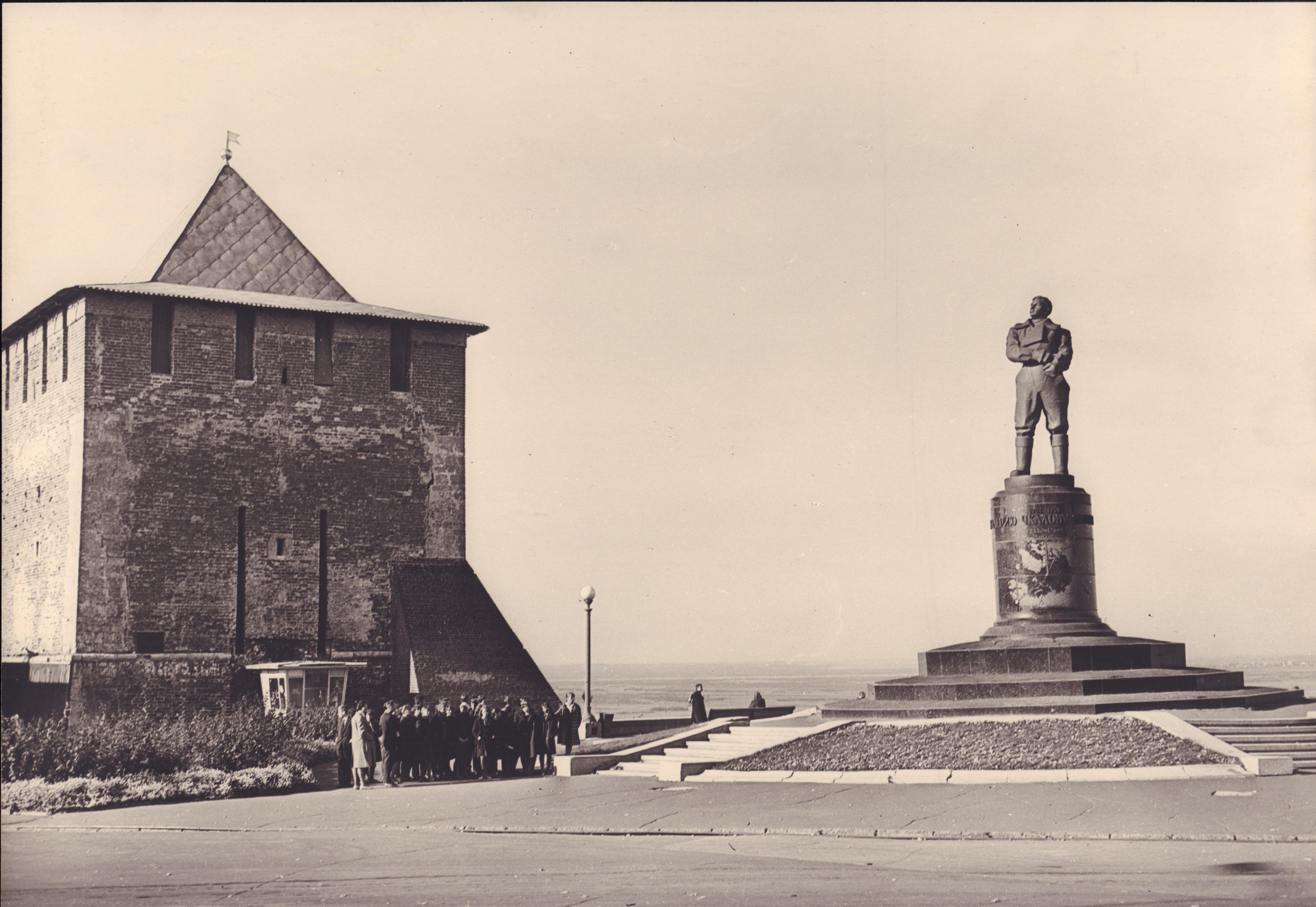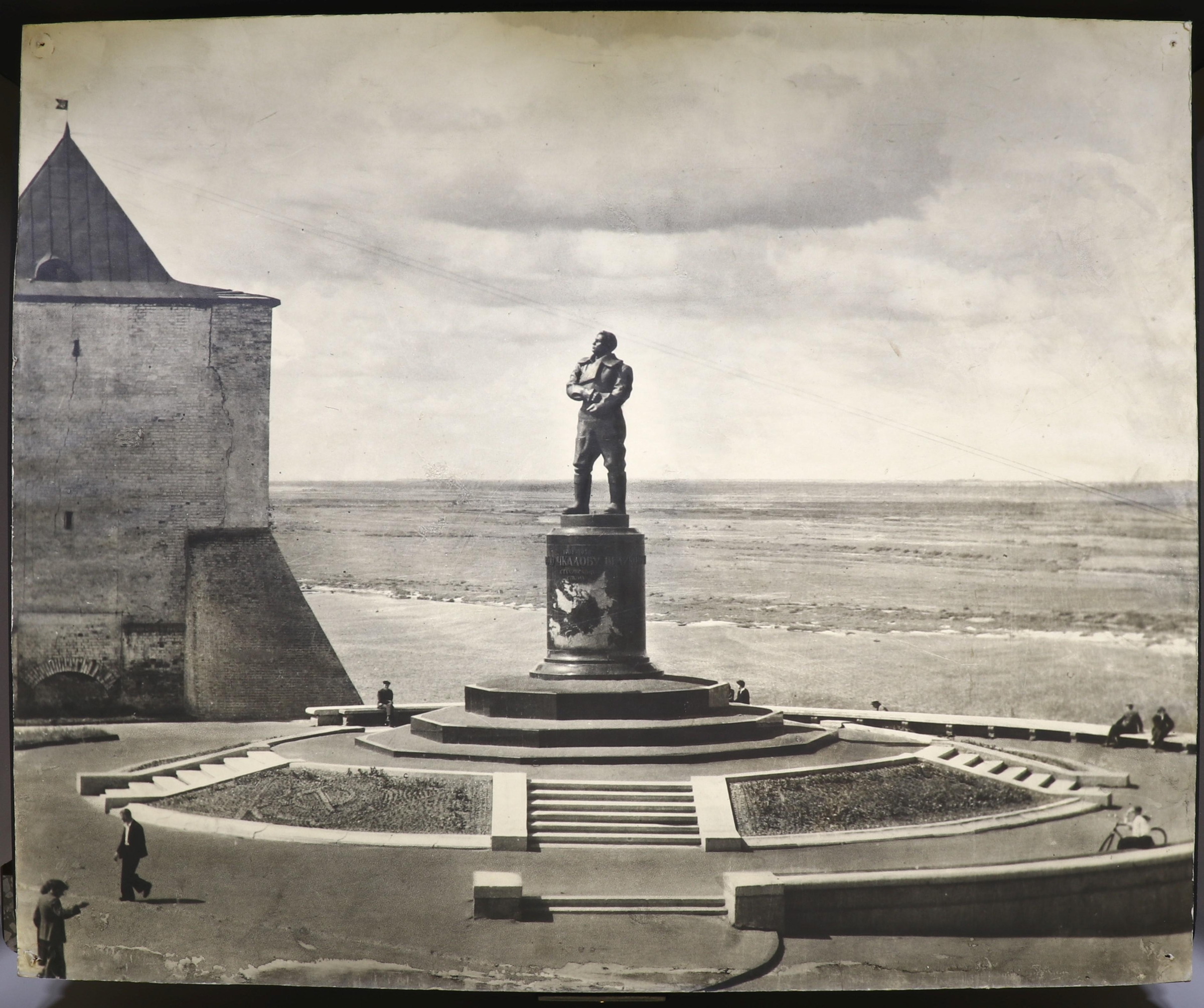 Валерий Павлович Чкалов (1904 ‒ 1938) ‒ уроженец Нижегородской губернии, летчик-испытатель, Герой Советского Союза. Памятник установлен во вторую годовщину гибели летчика 15 декабря 1940 года. Пилот запечатлен в летной форме в момент перед полетом. На пьедестале на схематичной карте Северного полушария пунктирами обозначены маршруты успешных беспосадочных перелетов на Дальний Восток в 1936 г. и в Америку через Северный полюс в 1937г.