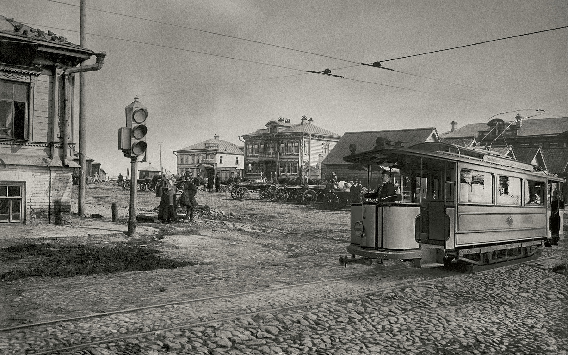 ﷯Трамвайное движение в Нижнем Новгороде было открыто еще в мае 1896 г. Первый трамвай в Российской империи запустили в Киеве в 1892 г., но Нижегородский электрический трамвай — самый старый в Российской Федерации. К 1910 г. в этой части Сенной площади, действительно, были проложены рельсы, но ходил по ним не электро-трамвай, а конка — повозка на конной тяге. Над рельсами на фото Сенной площади нет проводов воздушной контактной сети, а первый нижегородский трамвай бельгийской фирмы «Эрликон» питался от нее. В 1896 г. в Нижнем Новгороде существовало две трамвайные линии, которые в дальнейшем объединились и превратились в первое трамвайное кольцо. На снимке: фонарный трамвай Путиловского завода